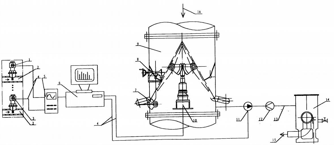 圖中:1、壓力壓差變送器2、凝汽器冷凝水分管道3、溫度測量變送器4、信號電纜5、污垢熱阻監測儀6、多媒體計算機7、出球水量調節器8、阻渦流調節器9、收球網10、電動執行機構11、膠球泵12、防止膠球倒流止回裝置13、管道14、裝球室15、箭頭16、箭頭