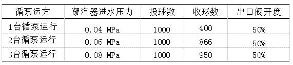 通過表2可看出,隨著循泵運行臺數(shù)增加,凝汽器的進口壓力升高,進、出口差壓增大,收球率大大提高。