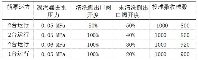 由表3可看出,調(diào)整未清洗側(cè)出口閥開度,從而增大清洗側(cè)壓差,膠球清洗裝置同樣可正常運行。