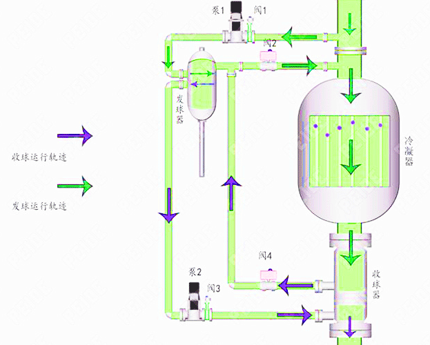 冷凝器膠球在線清洗裝置系統由二次濾網、收球網、裝球室、膠球泵、分匯器、閥門管路和電器控制裝置構成。選用合適的海綿膠球,球的濕態直徑比冷卻管內徑略大一點(約1~2mm),且濕態比重和水相近,將膠球投入裝球室內,數量為凝汽器進水室銅管數的15%左右,將裝球室封嚴,然后啟動膠球泵,打開系統兩端碟閥,膠球就在循環水進出口壓力差的作用下,被擠壓通過冷卻管,對冷卻管內徑進行一次抹擦,使管內壁污垢隨水流帶出,膠球隨循環水經出水管進入收球網,在收球網板的阻攔下,把膠球分離出來,由膠球泵抽出重新回到裝球室,如此循環返復對凝汽器冷卻管實現連續自動清洗。當清洗3個小時左右后,操作裝球室內的漏斗回位,運行3~5分鐘后即可收球。