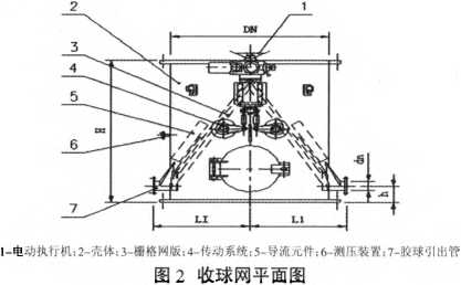 收球網布置于凝汽器出水管的垂直管段上,并盡可能遠離彎頭,讓水流在收球網內的分布盡量均勻;收球網的安裝方位要求為:兩根網板支撐軸與彎頭中心面平行,從而使兩片網板分流的水量相等,受力達到平衡,兩根膠球引出管的流量也能保持相等。