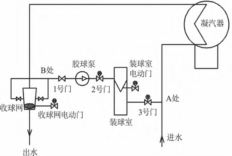 膠球清洗裝置正常運行時,收球網電動閥關閉,膠球泵和1號、2號、3號閥門開啟,膠球泵運行。膠球通過膠球泵的吸力,從凝汽器循環水出t收球網前打到凝汽器循環水進t。膠球清洗裝置收球時,關閉裝球電動閥,膠球在膠球泵和循環水的共同作用下,被帶至裝球內。