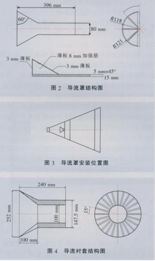 (2)在收球網(wǎng)距出球口900mm處加裝導流罩,通過導流罩改變了循環(huán)水流向,使循環(huán)水向收球網(wǎng)網(wǎng)板擴散,加強該區(qū)域循環(huán)水流撓動,防止膠球附著在收球網(wǎng)網(wǎng)板上。安裝前需打開收球網(wǎng)人孔,并使收球網(wǎng)處于打開狀態(tài),然后將加工好的導流罩用筋板焊接在收球網(wǎng)上。導流罩結構、安裝位置和導流襯套結構見圖2、圖3、圖4所示。