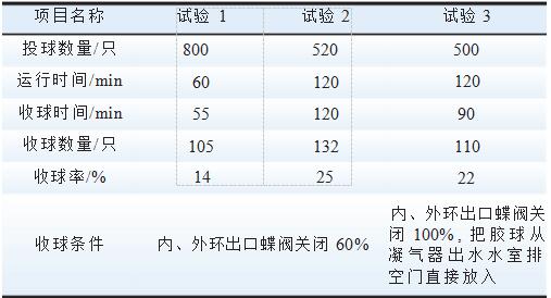 為驗證凝汽器內(nèi)部結構對收球率的影響進行了3次試驗,試驗數(shù)據(jù)見表2試驗3。