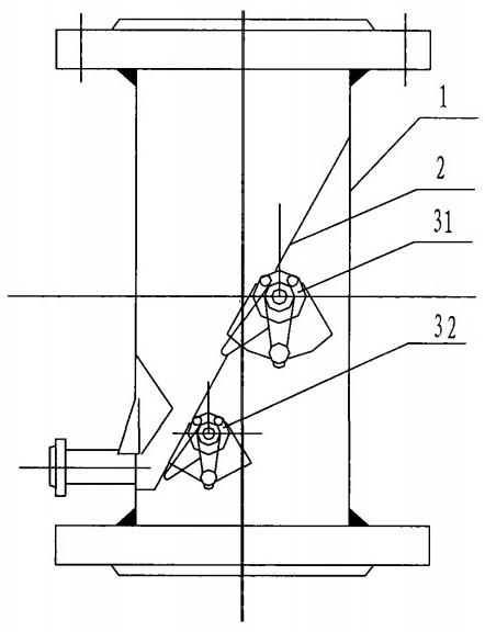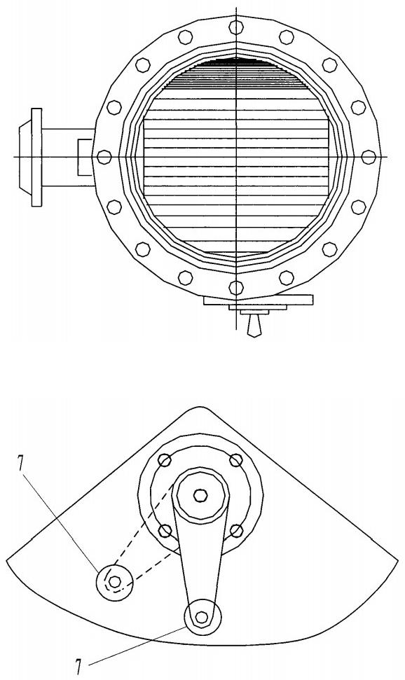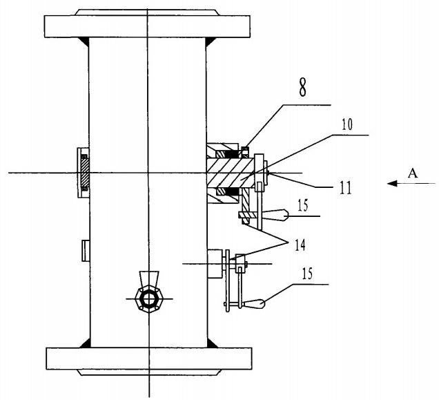 膠球清洗裝置參見圖1,圖1是實(shí)施例的主視圖,包括:安裝在主體1側(cè)壁上的柵板轉(zhuǎn)動(dòng)裝置31和柵板鎖緊裝置32和安裝在主體1內(nèi)的柵板2。柵板2的示意圖可參見該設(shè)備的俯視圖圖3,圖2為實(shí)施例中設(shè)備的左視圖,柵板轉(zhuǎn)動(dòng)裝置31包括:通過螺栓8固定在主體1側(cè)壁上的定位板14,定位板14的通孔中安裝有軸10,手柄15通過螺絲11固定在軸10上,當(dāng)手柄15轉(zhuǎn)動(dòng)時(shí),帶動(dòng)軸10旋轉(zhuǎn),軸10帶動(dòng)主體1內(nèi)的柵板閉合或開啟,如圖3所示。